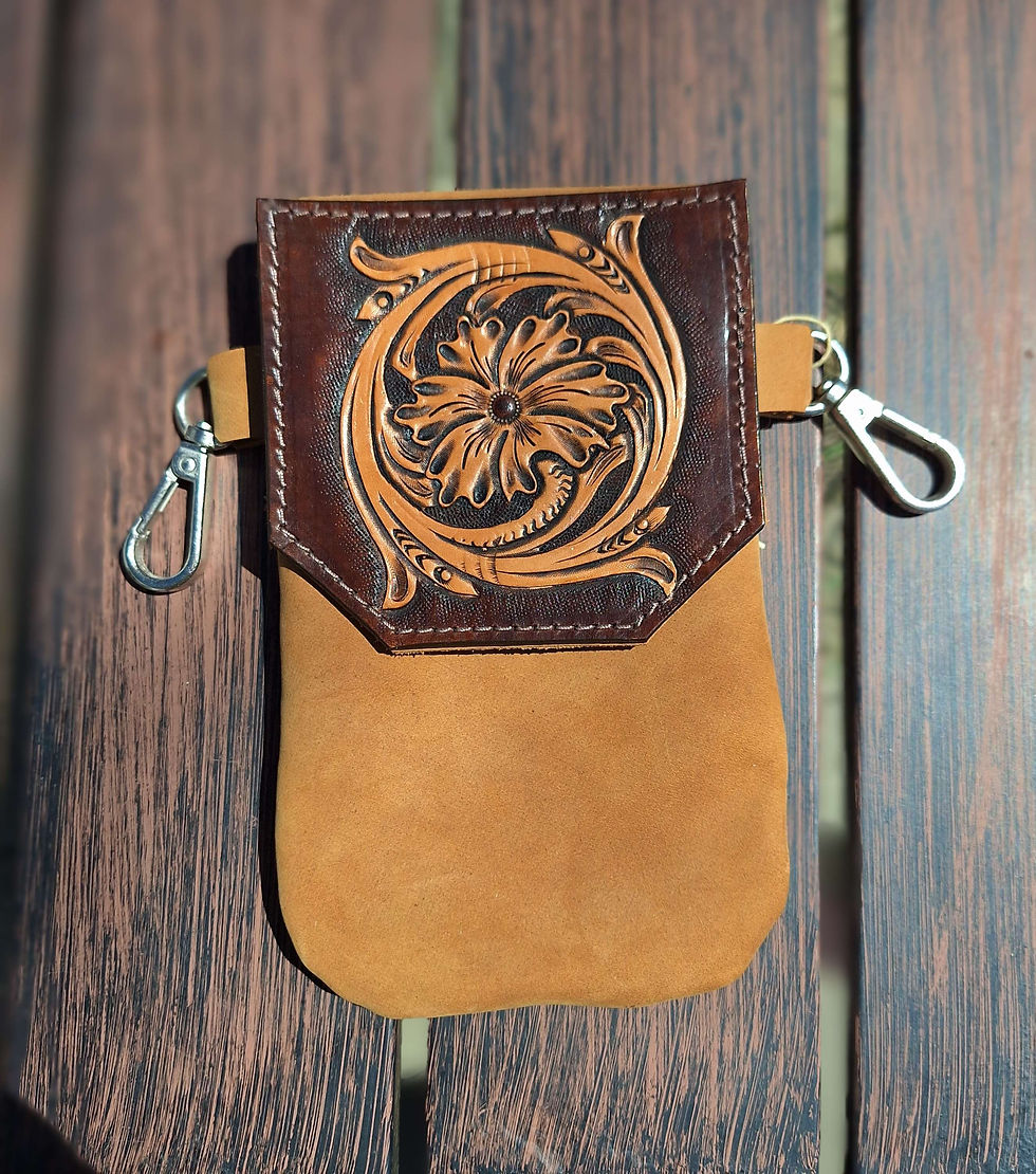 Tooled Floral w Cowhide Belt Loop Phone Holder